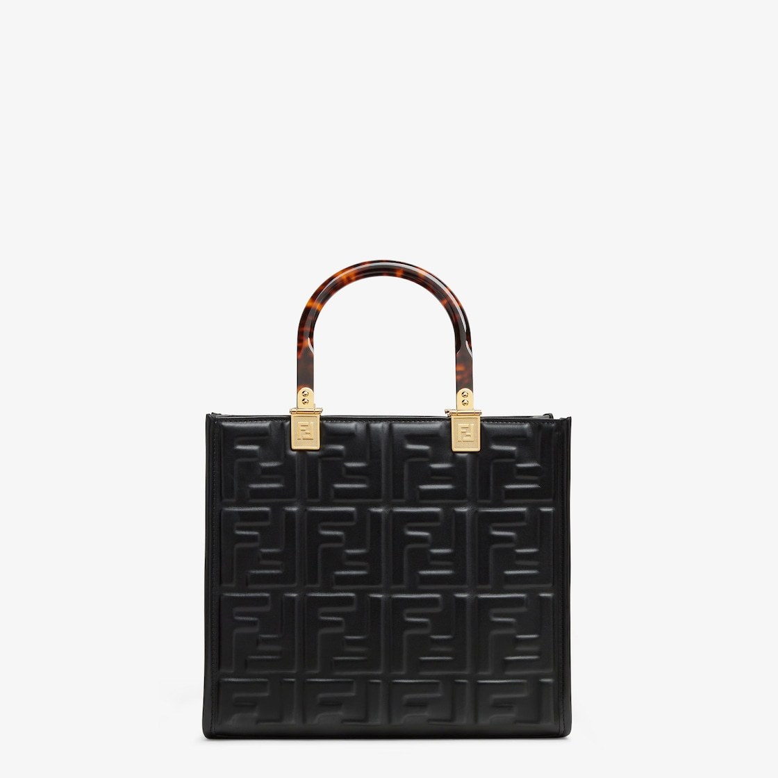 Small Sunshine Shopper bag made of black leather with raised three-dimensional textured FF motif and rigid tortoiseshell-effect plexiglass handles.